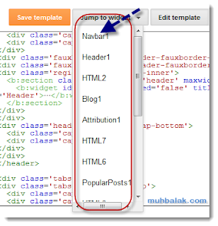 - Ada fitur yang bernama Jump to Widget. Dengan fitur ini kita bisa langsung menuju ke kode widget manapun yang kita inginkan dengan sekali klik pada nama ID widget yang tertera, ex: navbar1, Header1, HTML2, dsb